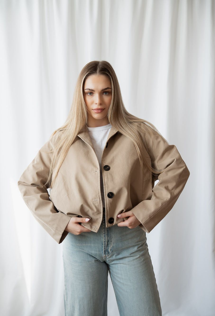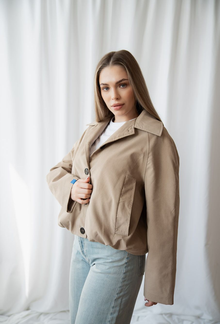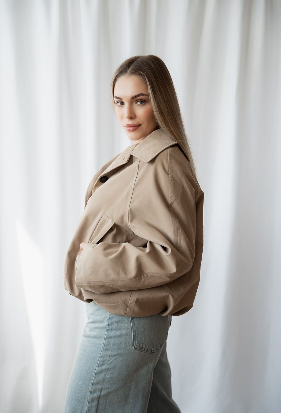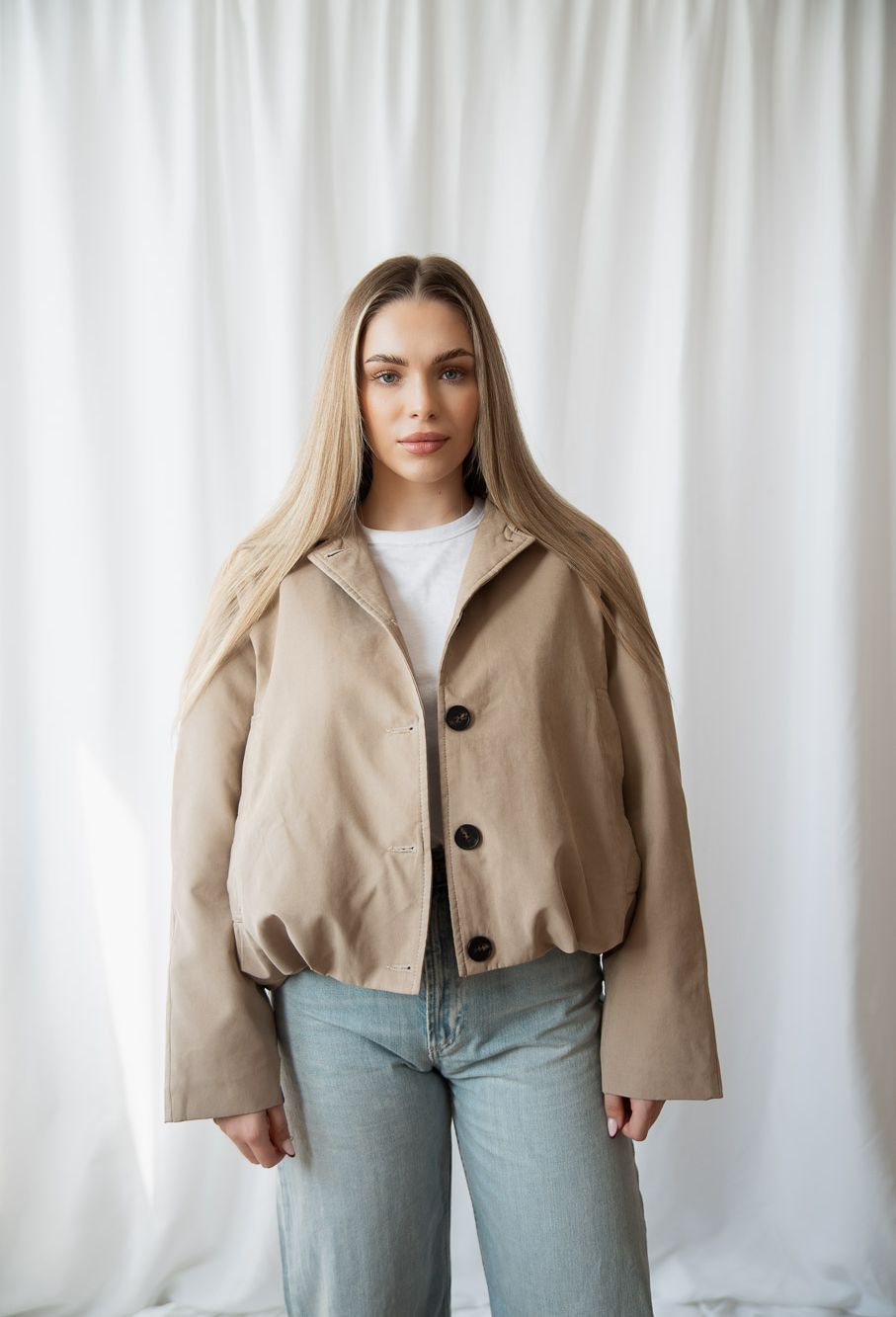 Dámska bomber bunda PEONIE je moderný kúsok, ktorý spája pohodlie, nadčasový dizajn a praktickosť do jednej výraznej siluety. Navrhli sme ju ako univerzálnu dámsku prechodnú bundu, ktorá sa ľahko kombinuje s denimom, elegantnými nohavicami aj minimalistickými basics kúskami. Táto dámska bomber bunda v béžovej farbe vyniká čistým strihom, jemne oversized proporciou a príjemným materiálom, ktorý krásne drží tvar. Minimalistický dizajn dopĺňajú kontrastné gombíky a jemný podpis značky – Studió logo na rukáve, ktoré zostáva decentným, no rozpoznateľným detailom.