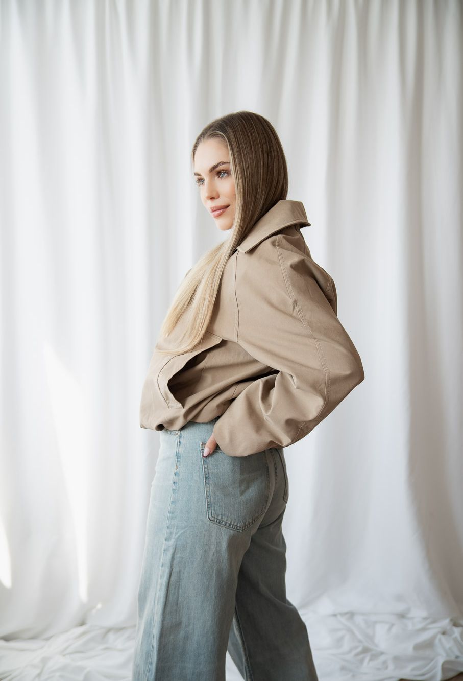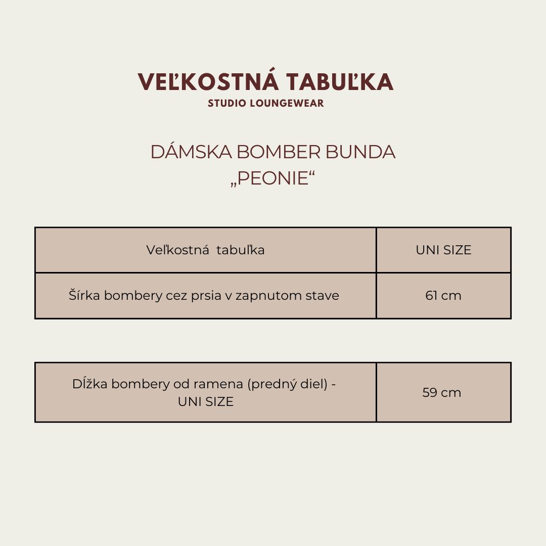 Dámska bomber bunda PEONIE je moderný kúsok, ktorý spája pohodlie, nadčasový dizajn a praktickosť do jednej výraznej siluety. Navrhli sme ju ako univerzálnu dámsku prechodnú bundu, ktorá sa ľahko kombinuje s denimom, elegantnými nohavicami aj minimalistickými basics kúskami. Táto dámska bomber bunda v béžovej farbe vyniká čistým strihom, jemne oversized proporciou a príjemným materiálom, ktorý krásne drží tvar. Minimalistický dizajn dopĺňajú kontrastné gombíky a jemný podpis značky – Studió logo na rukáve , ktoré zostáva decentným, no rozpoznateľným detailom. Pri návrhu sme mysleli aj na funkčnosť. Bunda má masívnejšiu prešívanú podšívku , vďaka ktorej je ideálna aj na chladnejšie rána alebo prechodné obdobie . Vďaka tejto vrstve pôsobí bomber bunda hrejivo, no zároveň zostáva ľahká a pohodlná na každodenné nosenie. Dominantným konštrukčným prvkom je masívny stojatý golier, ktorý elegantne modeluje siluetu a dodáva bunde výraznú architektúru. Dĺžka bundy je približne 59 cm, čo z nej robí ideálnu dámsku bomber bundu vhodnú k nohaviciam s vysokým pásom aj k denimovým rifliam. Prečo si bomber bundu PEONIE zamilujete • moderná dámska bomber bunda s nadčasovým strihom • univerzálna prechodná bunda pre ženy vhodná na jar aj jeseň • krásny béžový odtieň , ktorý ľahko skombinujete • prešívaná podšívka pre príjemné teplo počas chladnejších rán • pohodlný materiál, ktorý drží tvar a dobre sa nosí • univerzálna veľkosť • jemný podpis značky – Studió logo na rukáve PEONIE je bomber bunda, ktorá pôsobí uvoľnene, no zároveň premyslene. Kúsok, ktorý si oblečiete ráno a prirodzene doplní celý outfit.