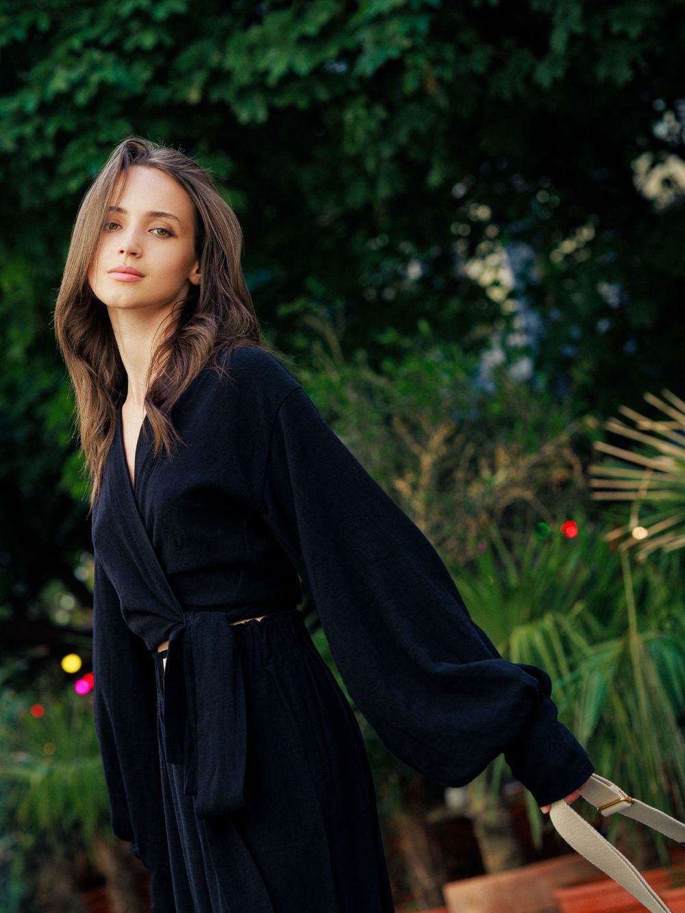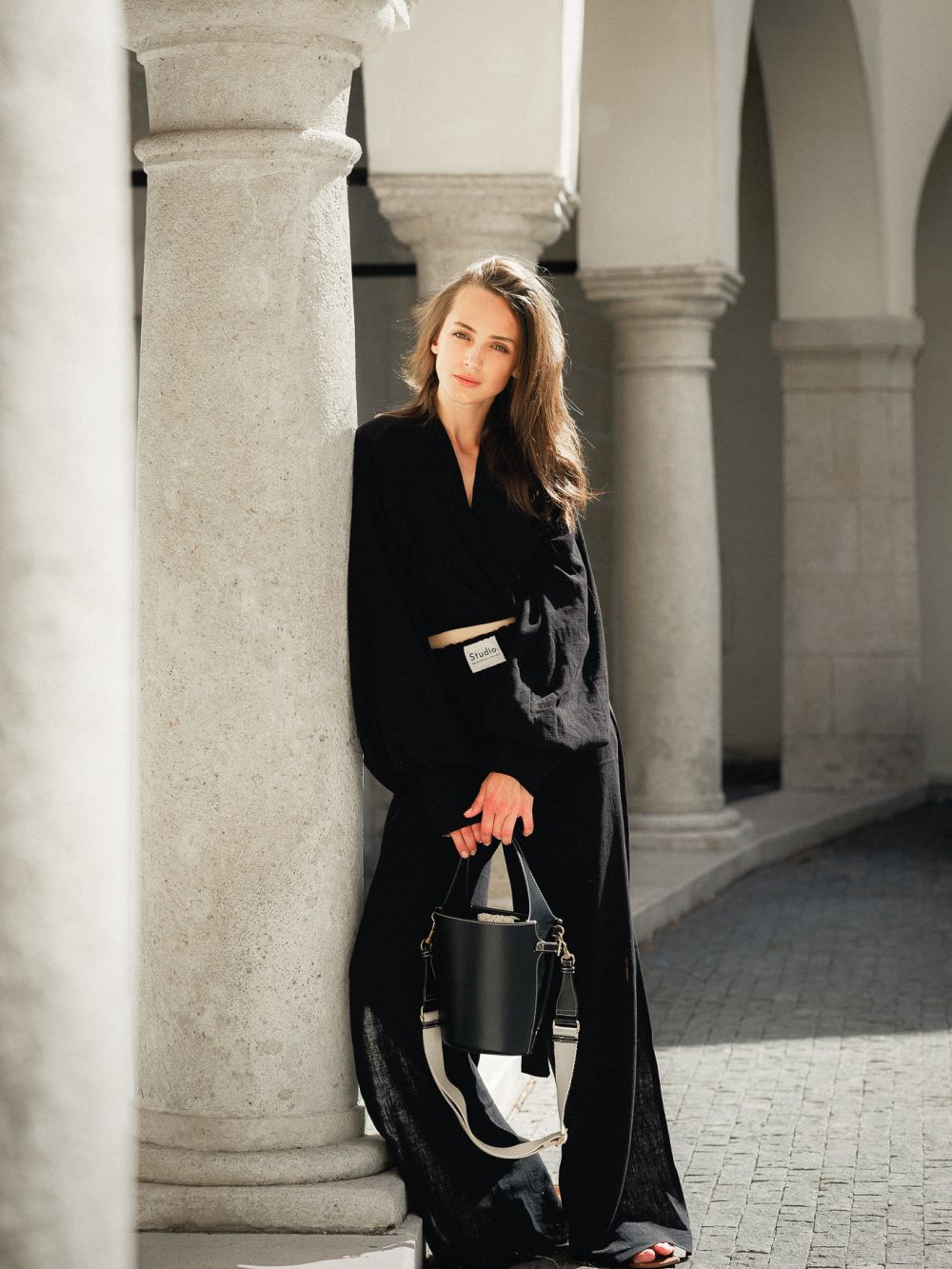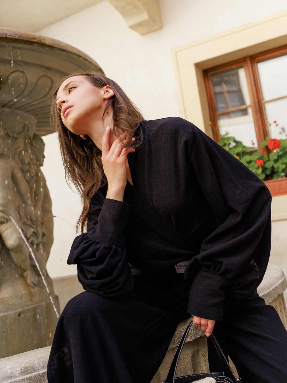 Ľanová blúzka Mileva – vzdušná ako pierko, jemná ako letný dotyk. Ľanová blúzka Mileva je stvorená pre ženy, ktoré sa neboja byť videné a zakaždým štýlové. Ušitá z prémiového, priedušného ľanu, ktorý je mäkký na dotyk a dokonale sa prispôsobí tempu slnečných dní. Zavinovací strih umožňuje nekonečné možnosti stylingu – noste ju s výstrihom vpredu alebo chrbtom vpred, previazanú v páse či uvoľnenú ako kaftan. Dlhé viazanie elegantne zvýrazní siluetu a rozparky na rukávoch dodajú každému pohybu ladnosť a ľahkosť. Funkčnosť v spojení s nadčasovou estetikou. Mileva je ľanová blúzka, ktorá vás prevedie letom – od rán pri mori až po večery v meste. Nadčasový kúsok navrhnutý a ušitý na Slovensku pre ženy, ktoré hľadajú rovnováhu medzi štýlom, komfortom a vedomým nosením. Variabilná ľanová blúzka pre letné dni plné elegancie a voľnosti.